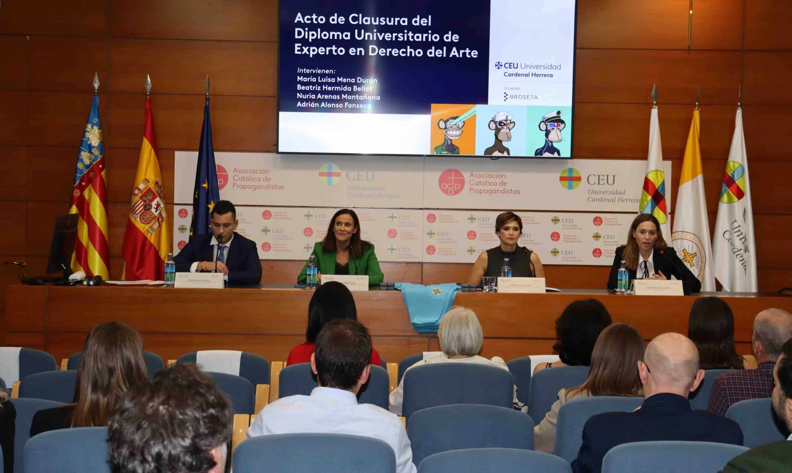 La Universidad CEU Cardenal Herrera ha clausurado la tercera edición del Diploma universitario de Experto en Derecho del Arte en el Palacio de Colomina de Valencia. Este título se imparte presencialmente y por hyflex, lo que permite que puedan conectarse alumnos de todas partes del mundo. Por este motivo, el seguimiento del acto ha sido de forma presencial y por streaming para aquellos alumnos y/o familiares que se encuentran en otros países.