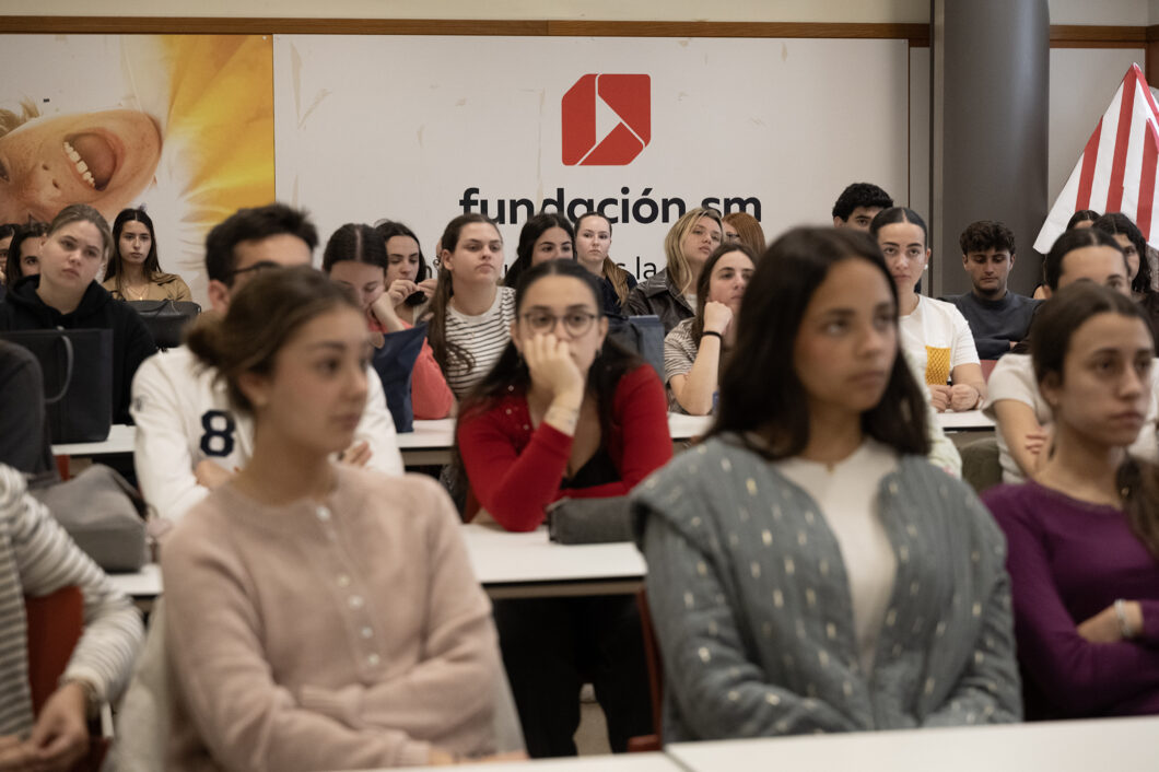 La directora de la Fundación le presentó a los estudiantes el trabajo que realizan y el impacto de las acciones socio-caritativas que llevan a cabo gracias a los beneficios que obtienen del área editorial. “Me llena de emoción estar aquí, me impresiona porque veo que nos tenéis presentes y porque, además, yo empecé como vosotros. Tenía muy claro que quería ser maestra y el 97% habéis elegido esto por vocación y porque queréis enseñar”, empezó comentando Ortíz a los estudiantes. “Nuestro objetivo es conseguir la equidad educativa, trabajamos con los que están en los márgenes, para que nadie se quede sin estudiar. Además, desarrollamos escuelas que cuidan”, explicó la directora de la Fundación SM.