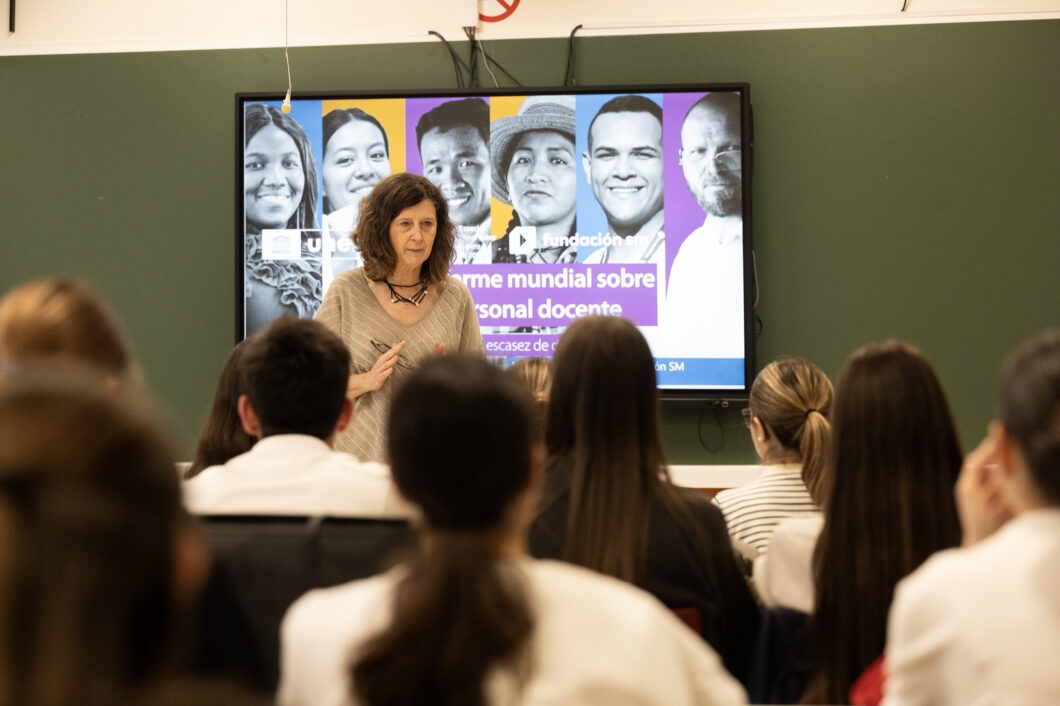 El informe menciona el punto 4 de la agenda 2030, donde se afirma que en 2030 la Educación Primaria y Secundaria debería ser universal. Sin embargo, Ortíz habló sobre la escasez de profesionales en este sector: “en el mundo faltan 44 millones de docentes, ¿habéis escuchado alguna profesión donde falte tanta profesional? Hacéis mucha falta al mundo”, les dijo a los futuros maestros.