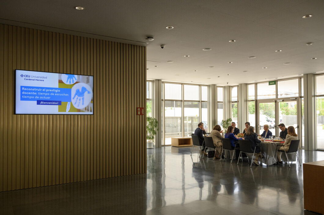 Ese mismo día, antes de la charla con los estudiantes, Ortíz participó en el desayuno-coloquio “Reconstruir el prestigio docente: tiempo de escuchar, tiempo de actuar”. Un encuentro en el que profesionales del ámbito educativo reflexionaron sobre los desafíos actuales del profesorado. De la mano de Maite Ortiz, directora de la Fundación SM, se analizaron las principales conclusiones del Informe mundial sobre el personal docente y se compartieron inquietudes, experiencias y propuestas en torno a un reto común: impulsar escuelas que cuidan. El encuentro propició una reflexión especialmente valiosa sobre la importancia de la ética del cuidado y del bienestar docente como base de una educación de calidad. En la sesión participaron representantes de distintas instituciones educativas, entre ellos Ana Marín Medina, de la Federación de Centros de Enseñanza de Valencia; Raquel Mira García, del Colegio CEU San Pablo; Vicente J. Moliner, del Colegio Sagrada Familia de la Fundación PJO; Guillermo Chumillas Jiménez, del Colegio Carmelitas San Enrique; Miguel ÁngelSavall, de Foredu; Carlos Bueno López, de la Fundación Trilema; y los profesores del CEU UCH Jose Amiguet Esteban, María Calvo Barrachina y Rosa García Bellido