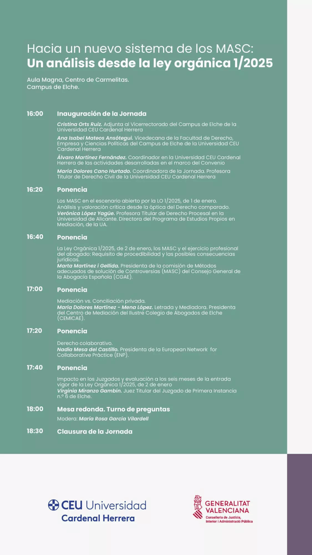 La jornada “Hacia un nuevo sistema de los MASC”, impulsada por la Generalitat Valenciana y coordinada por la profesora Lola Cano, reunirá en el CEU de Elche a juristas de primer nivel para analizar el alcance de la nueva Ley Orgánica 1/2025