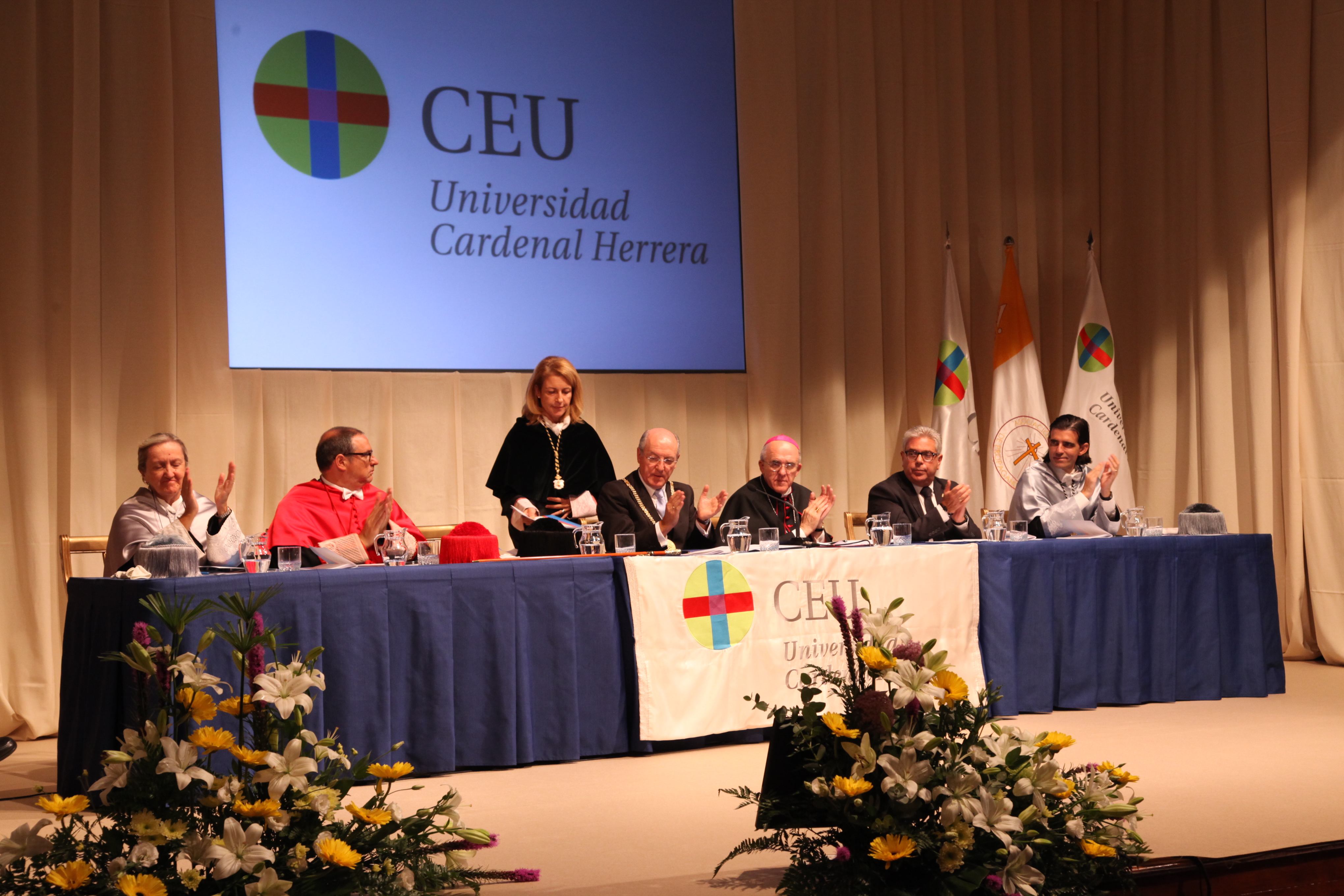 El acto académico ha sido presidido por el Gran Canciller de la Universidad CEU Cardenal Herrera y presidente de la Fundación Universitaria San Pablo-CEU, Carlos Romero, y la rectora de la CEU-UCH. Les han acompañado en la mesa presidencial Monseñor Carlos Osoro; el director general de Universidad, Estudios Superiores y Ciencia de la Conselleria de Educación, Felipe Palau; el secretario General de la CEU-UCH, José Manuel Amiguet; el alcalde de Moncada, Juan José Medina; y la doctora Isabel de Salas, autora de la Lección Inaugural del Curso.
