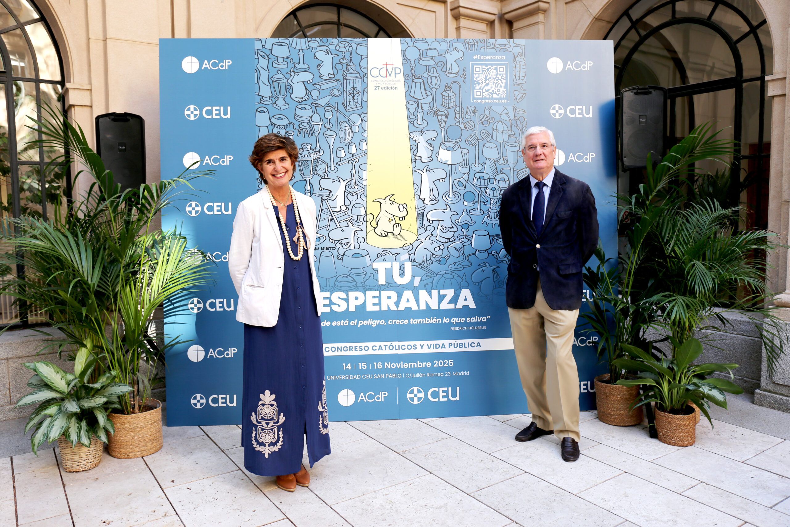 En un acto en el que han participado el vicepresidente de la ACdP, José Masip, y la vicesecretaria general de la ACdP, María San Gil, Masip ha explicado el lema del encuentro, “hay que diferenciar ‘tu esperanza’, en sentido posesivo por ese Tú que es Dios, pero también el prójimo. La esperanza es algo a lo que un católico no puede renunciar”. Sobre el cartel, en el que se ve un mundo oscuro y un foco de luz que ilumina al único de los personajes, el codirector del congreso ha comentado que llevar la cruz en el pecho, como hace el protagonista de la viñeta “siempre nos va a dar la esperanza para seguir el camino hacia Cristo”.