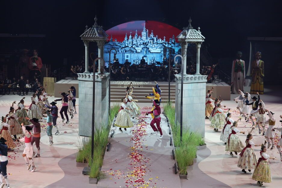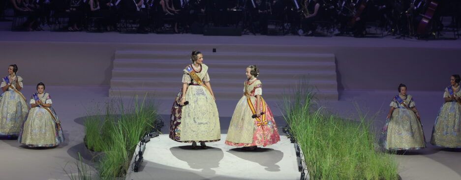 El espectáculo, bajo el lema “Llum” ha rendido homenaje a la tierra valenciana, al 775 aniversario de la Comunidad de Pescadores de El Palmar y a los 700 años de la fiesta del Corpus. Todo ello en un escenario diseñado por el arquitecto Nacho Fernández, donde ha utilizado la concepción que tenía el pintor valenciano, Joaquín Sorolla, de la luz y su visión de España como inspiración para el telón de fondo. Al acto no le ha faltado la música en directo, ya que la Banda Sinfónica, compuesta por 65 músicos valencianos y dirigida por el maestro Montesinos, ha ofrecido una interpretación llena de fuerza y sensibilidad, creando así una atmósfera única. Además, justo al final de la primera parte del espectáculo, con los bailarines en el escenario y al ritmo de “Mi tierra” del cantante valenciano Nino Bravo, las 156 candidatas muy emocionadas y agrupadas por sectores, han dado dos vueltas al escenario, aunque no ha sido hasta después cuando han desfilado de manera individual.
