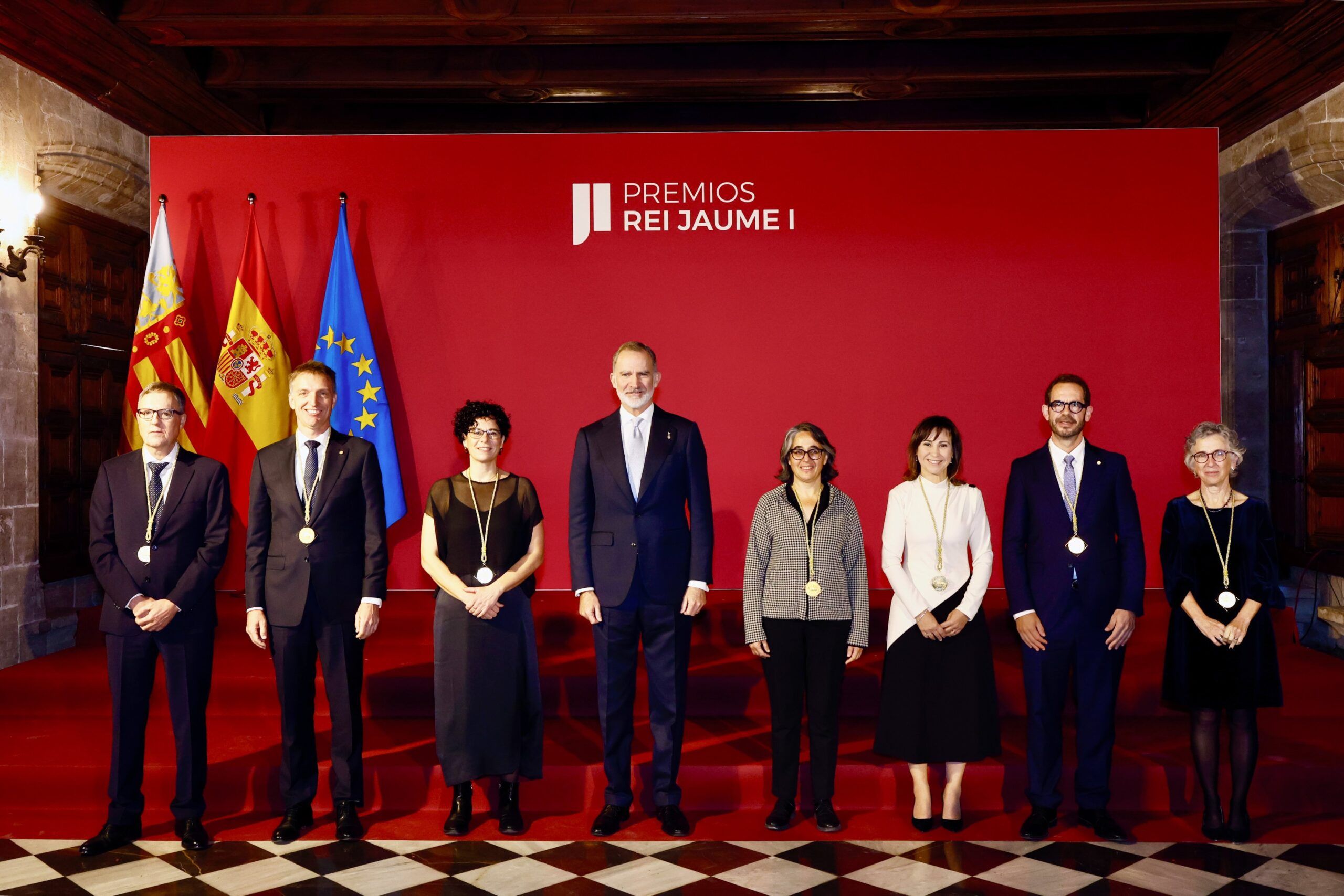 El secretario y presidente ejecutivo de la fundación, Javier Quesada, reflexionó sobre las nuevas políticas de educación e innovación impulsadas en Estados Unidos y reivindicó la importancia de visibilizar premios como los Rei Jaume I. Después leyó el acta de los jurados, donde se justificaban las decisiones y méritos de cada galardonado. Concluido su discurso, los presidentes de la fundación, el Rey, la ministra y la alcaldesa se situaron juntos en el escenario para entregar las medallas. Uno a uno, los premiados fueron recibiéndolas y posando para la fotografía oficial.