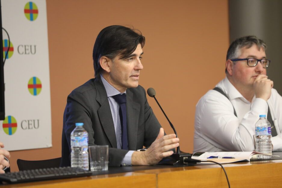 La sesión ha sido presentada por el decano de la Facultad de Comunicación, José Manuel Amiguet, y ha contado con las intervenciones de los profesores Jaime Vilarroig, de la CEU UCH, y Alfonso Martínez-Carbonell, doctor en Derecho y especialista en pensamiento social y educativo católico.